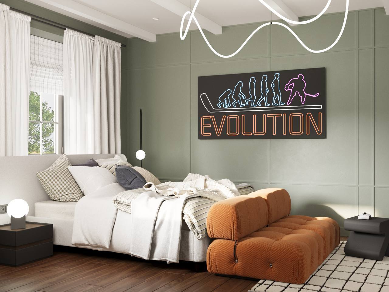 - Зона сна: кровать, ночник, полка с книгой на ночь. Уют и покой — главное правило.